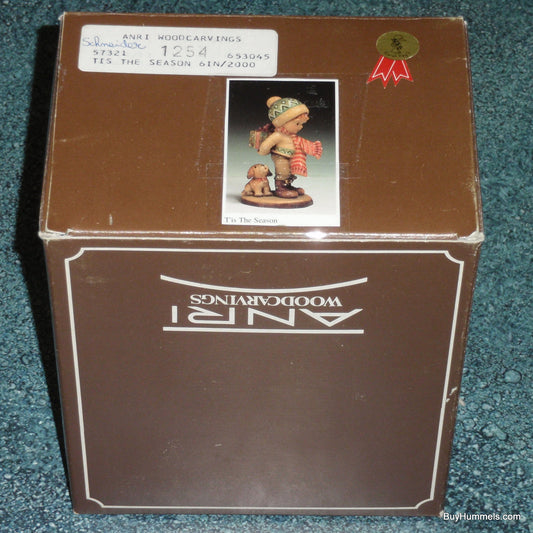 Anri Sarah Kay “TIS THE SEASON” Christmas Woodcarving 6" Figurine With Box - Little Boy With Puppy Dog And Christmas Gift!