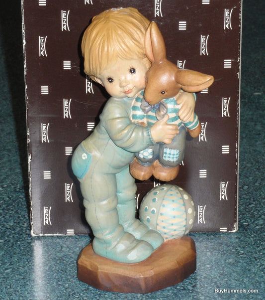 Anri "Bunny Hug" Hand Carved & Painted 7" Figurine By Sarah Kay - Little Boy With His Stuffed Animal - CUTE EASTER GIFT!