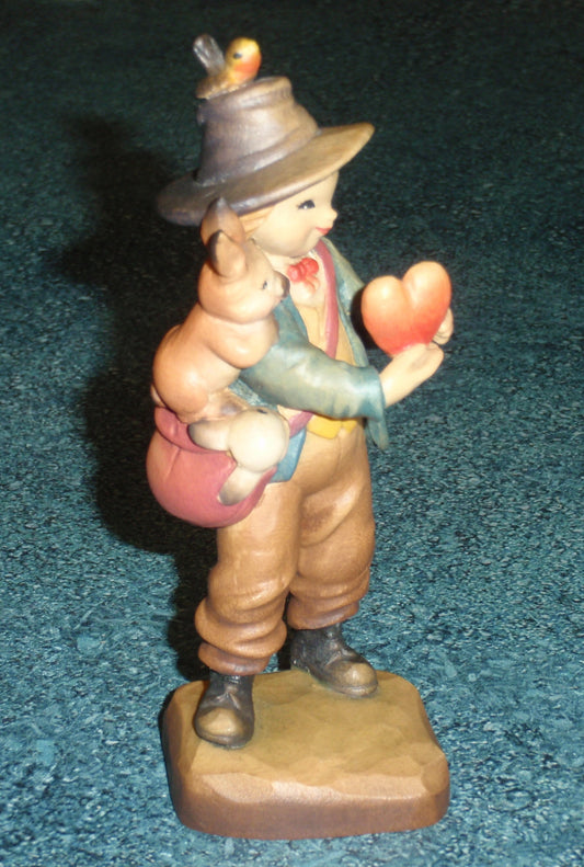 Anri "Will You Be Mine" 4.5" Hand Carved Wood Figurine By Ferrandiz With Box - Boy With Heart In His Hands And Bunnies And Bird As Friends!