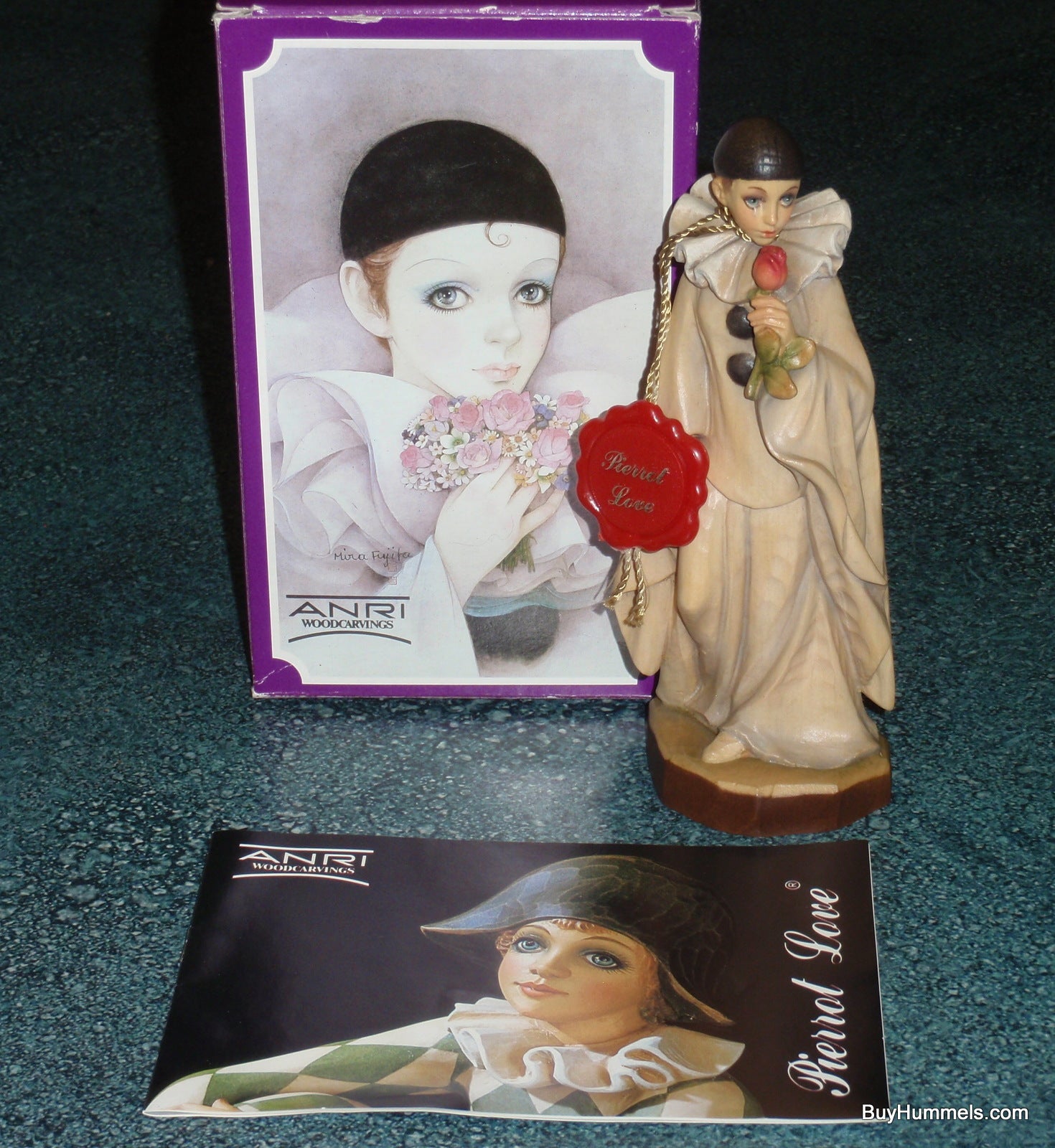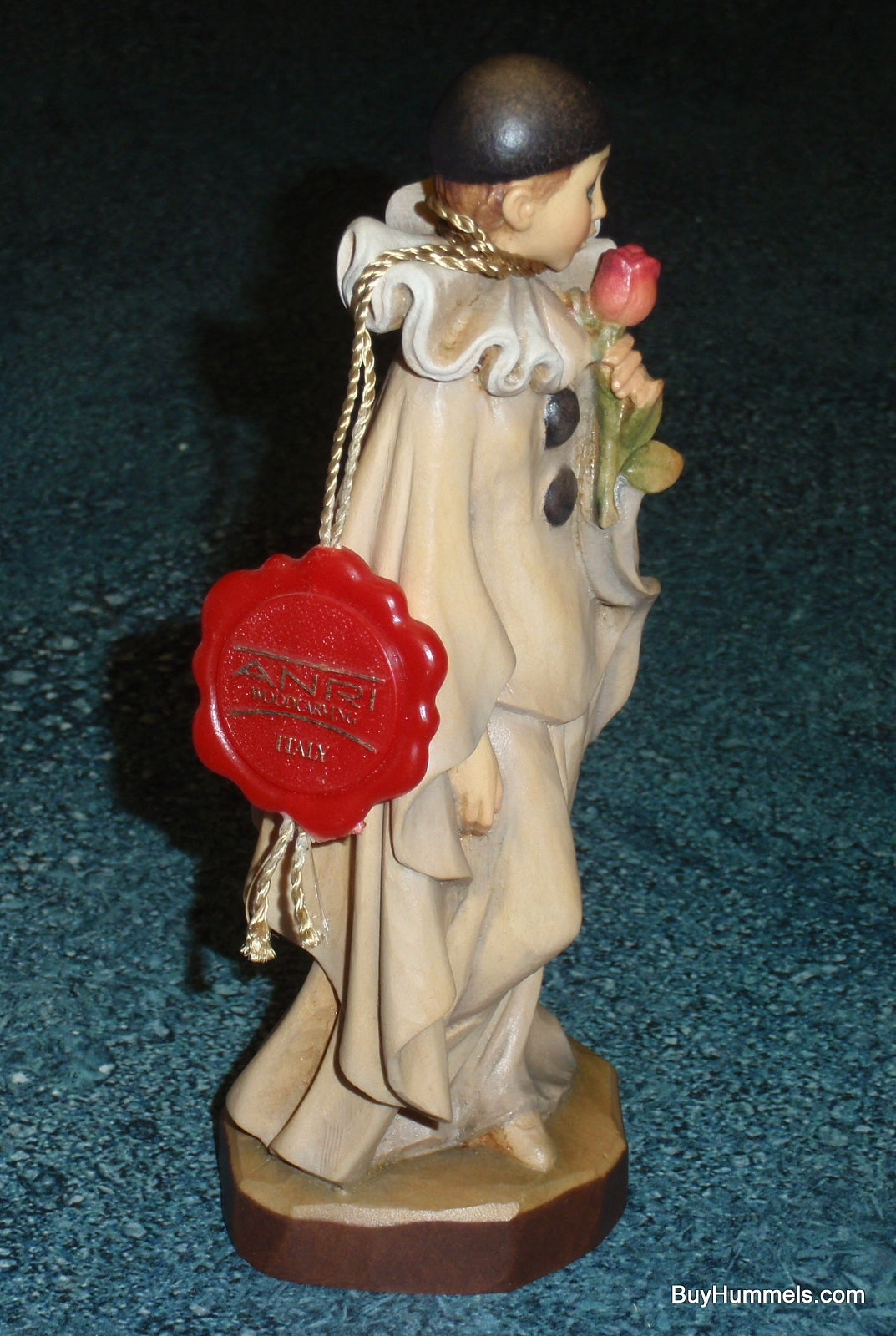 Discover the captivating Anri 6" wood carving, "Love Remembered" Clown Figurine (#654162). This exceptionally rare collectible, direct from Italy, is a poignant portrayal of a clown holding a rose and shedding a tear for a lost love. In truly amazing condition, free of chips, cracks, or repairs, and presented with its original box. This piece, measuring approximately 6" tall, showcases the exquisite detail Anri is renowned for. Don't miss this unique opportunity to add a piece of heartfelt artistry to your collection. Part of our extensive liquidation of Anri figurines and other fine collectibles.