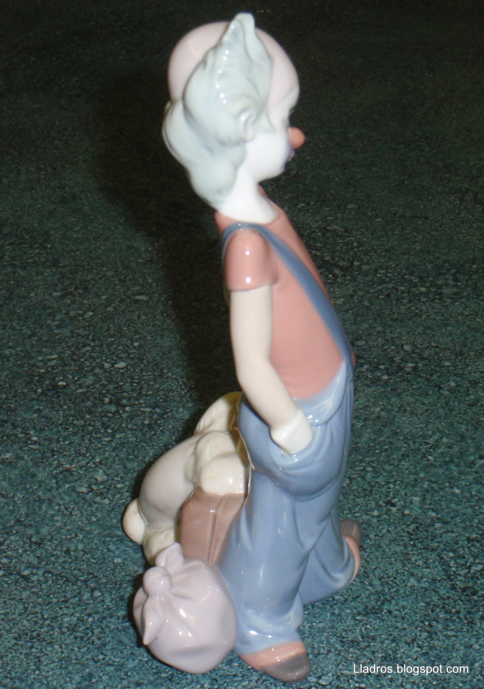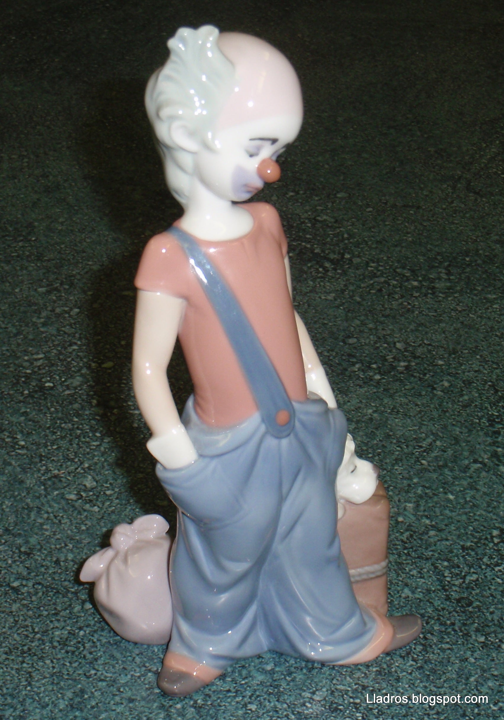 Step inside the world of the traveling circus with Lladro's "Destination Big Top" #6245. This beautifully emotive figurine depicts a young clown in traditional oversized attire, pausing for a moment of rest on his suitcase. His loyal puppy dog peeks out from beside him, creating a heartwarming scene of companionship and the "weary traveler" spirit.