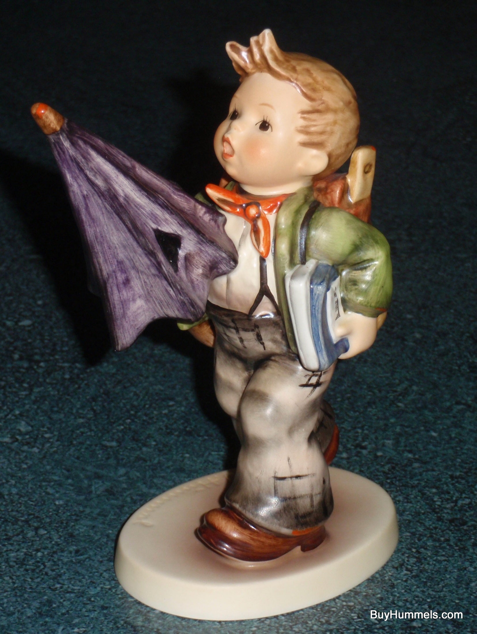 Capture a moment of childhood wonder with "Is It Raining?" #420. This delightful Goebel Hummel figurine features a young boy dressed in his traditional Bavarian jacket and scarf, holding a large purple umbrella, books in hand, and a backpack. With his face tilted upward and umbrella closed up, he perfectly embodies the simple curiosity of a rainy afternoon.