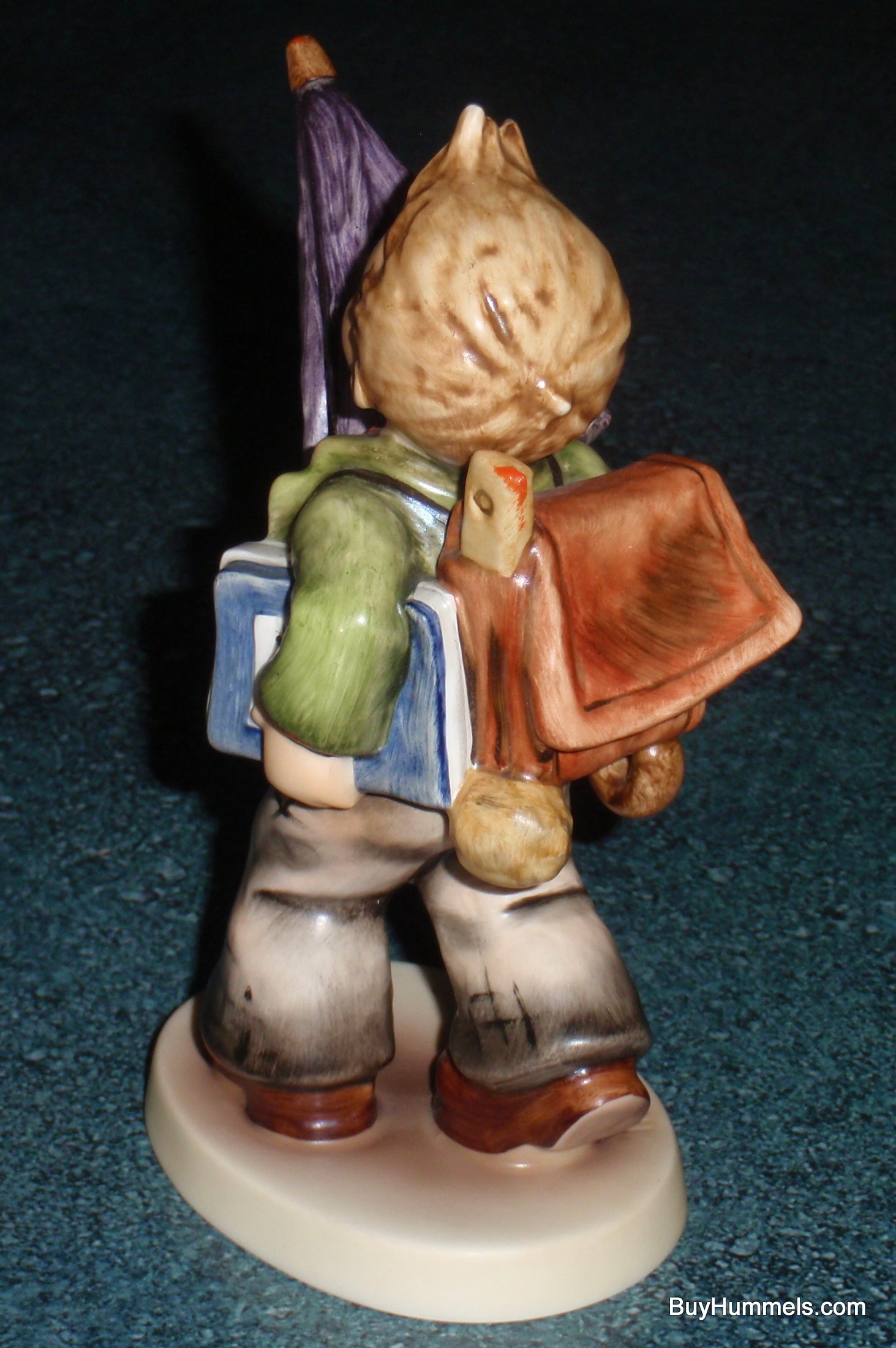 Standing approximately 5-3/4 inches tall and 4-1/4 inches wide, this piece was designed by Master Sculptor Gerhard Skrobek. It is a wonderful example of Skrobek’s signature style—blending detailed textures, like the leather satchel and the folds of the umbrella, with expressive, lifelike poses. This figurine typically carries the TMK-6 or TMK-7 trademark, showcasing the vibrant, hand-painted matte finish that defines authentic M.I. Hummel porcelain.