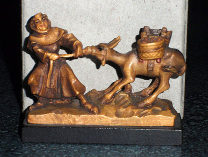 Italian Anri Miniature Wood Carving of Monk and Stubborn Donkey SIGNED With Original Box!
