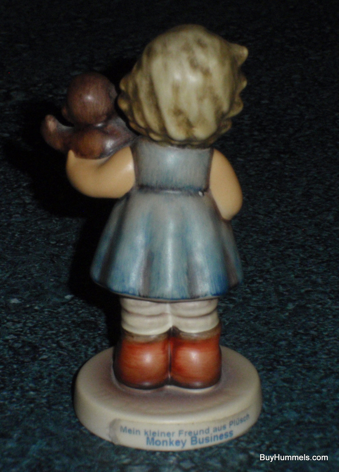 This charming Hummel figurine, titled "Monkey Business," features a playful scene of a little girl and her baby monkey companion. The figurine stands approximately 3.5 inches tall and is identified as #2069/B.