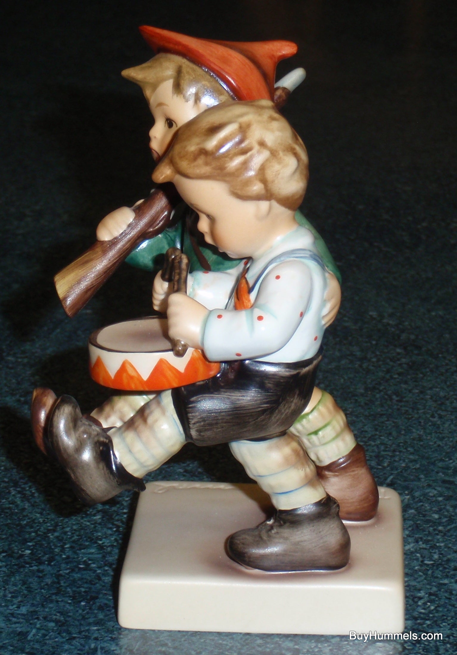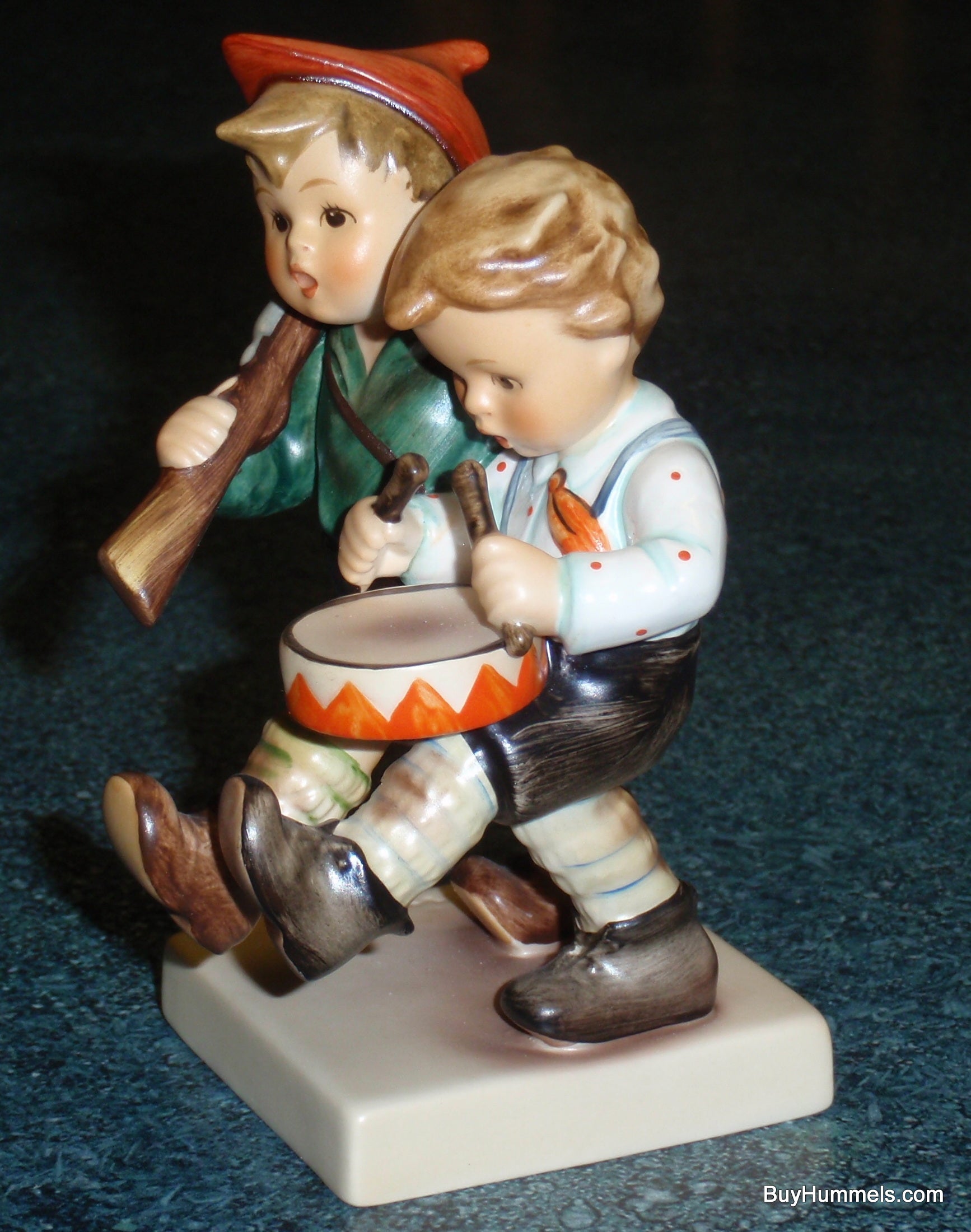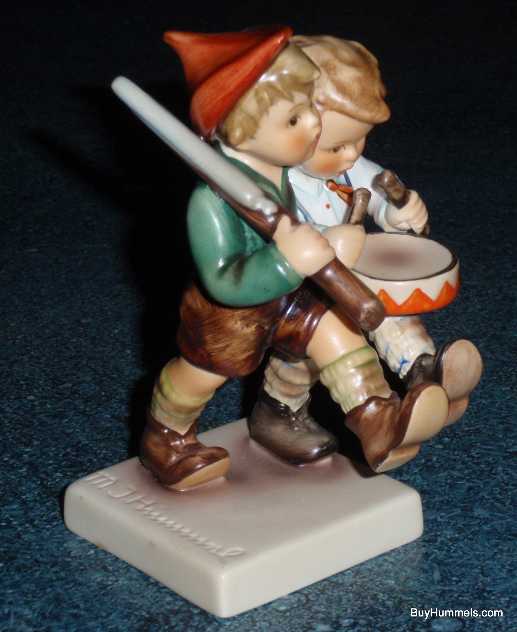 Hear the Marching Beat with "Volunteers" Hummel #50 2/0! Imagine the sound of a playful drumbeat and the determined steps of young volunteers! This charming Hummel figurine (#50 2/0) captures that very moment, featuring two boys, one armed with a rifle, the other with a drum, marching with youthful enthusiasm. Standing at 4-3/4", this piece is in excellent condition, with vibrant colors that bring the scene to life. A delightful addition to any Hummel collection, this "Volunteers" figurine is ready to march its way into your heart.